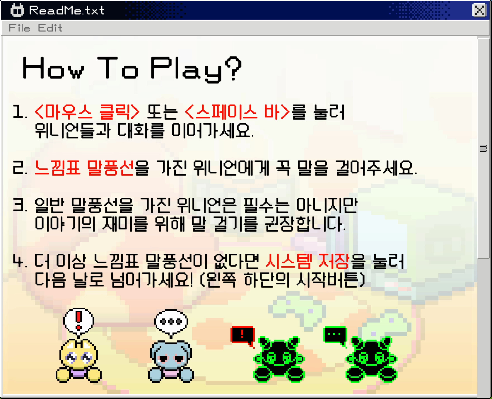 - 다섯 명의 개성 있는 위니언: 각기 다른 성격을 가진 다섯 명의 위니언이 등장하며, 이들은 귀여운 픽셀 그래픽으로 표현됩니다.