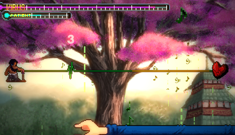 - 게임플레이 및 시스템 특징 : 컨트롤은 스페이스바 하나만 사용합니다. 박자에 맞춰 스페이스바만 누르면 되어서 진입장벽이 낮습니다. 핵심 규칙은 '일곱 번째 박자'에 맞춰 눌러야 한다는 것! 이 단순함 덕분에 처음 접해도 쉽게 할 수 있지만, 이후 나오는 레벨은 단순하지 않습니다. 각 스테이지, 즉 각 환자 치료 시퀀스마다 리듬 패턴이 달라지고, 일부는 복잡한 폴리리듬, 불규칙 박자, 변칙 리듬 등 음악 이론을 반영한 리듬 구조를 사용합니다. 그래서 단순한 리듬 게임이 아니라 '리듬 감각, 적응력, 집중력'을 요구합니다. 총 20개 이상의 레벨이 존재하며, 각 레벨은 독자적인 스토리와 연출, 음악을 갖고 있어 단순 점수 노리는 게임이 아니라 '이야기, 리듬, 분위기'가 섞인 체험을 제공합니다. 단순 스토리보드 뿐 아니라 친구랑 같이 할 수 있는 로컬 멀티플레이 옵션도 있고, 커뮤니티에서 레벨을 만들고 공유할 수 있는 레벨 에디터까지 제공되어서 오래 붙잡고 놀 수 있는 구조입니다. 정식 1.0 버전에서는 최종 스토리 칩(파이널 액트)이 추가되고, Night-Shift 같은 높은 난이도 버전도 제공됩니다.